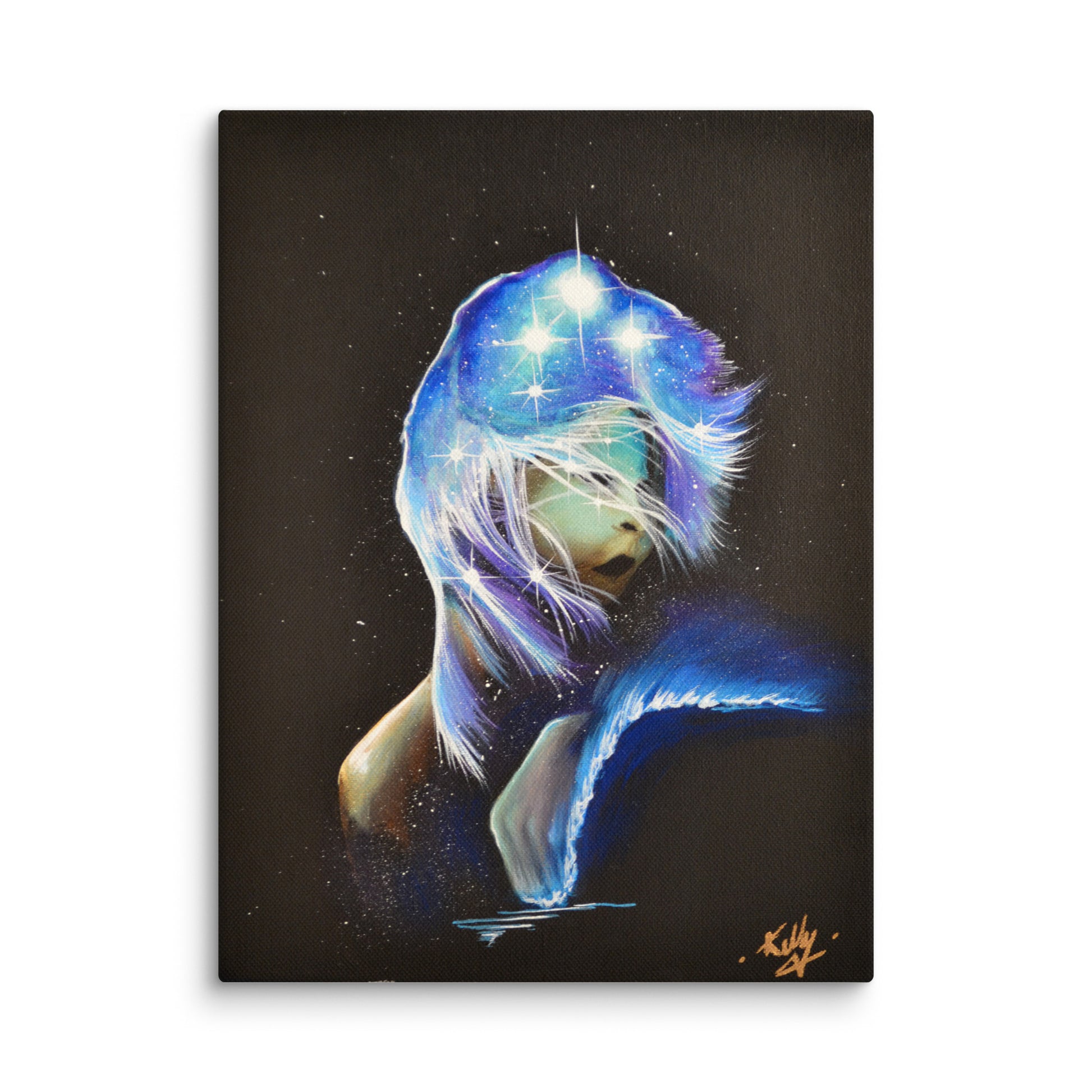 "Ry" is a celestial portrayal of human introspection and cosmic beauty, seamlessly interwoven by Kelly Silva. This artwork transcends the traditional boundaries of portraiture, marrying the essence of the night sky with the human form. The subject's hair flows like the Milky Way, strands infused with stardust and punctuated by brilliant stars that reflect the infinite expanse above us.